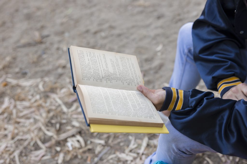 A closeup shot of a male with his hand on the bible on a wooden table with a blurred background